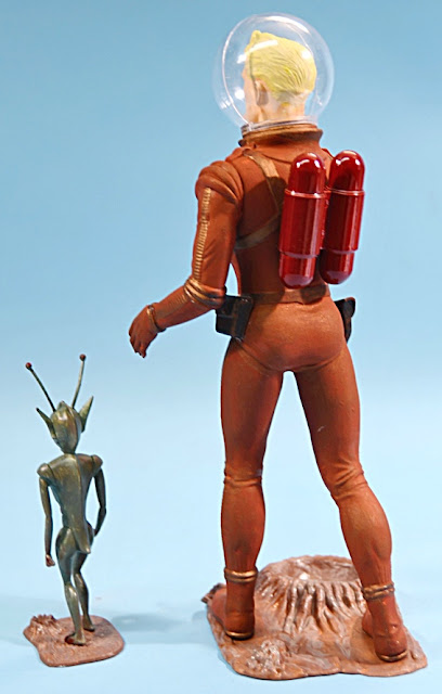 The Martian ET consists of just two components, its front and back. The creature has a base, as does Flash Gordon, and there also is a nameplate. The Flash Gordon figure has 23 components.